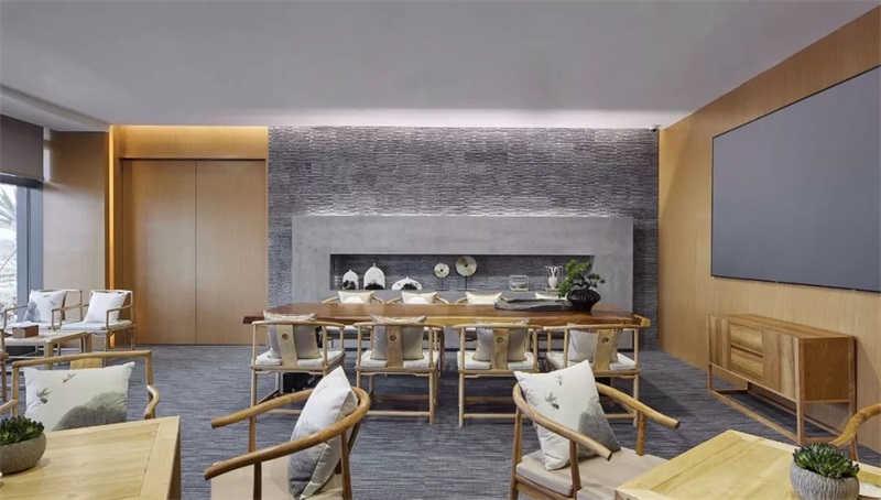 每一層的開敞辦公空間,延續(xù)黑白灰風(fēng)格的同時(shí),在一些節(jié)點(diǎn)空間及交流空間的設(shè)計(jì)中融入暖色家具及軟裝布置,除了可以緩和嚴(yán)肅工作氛圍,更為樸素的空間觀感增添了別樣的風(fēng)味。狹長條形飾燈勾勒出硬朗的結(jié)構(gòu)走線,點(diǎn)布圓形飾燈將柔和的光亮灑遍空間各個(gè)角落。