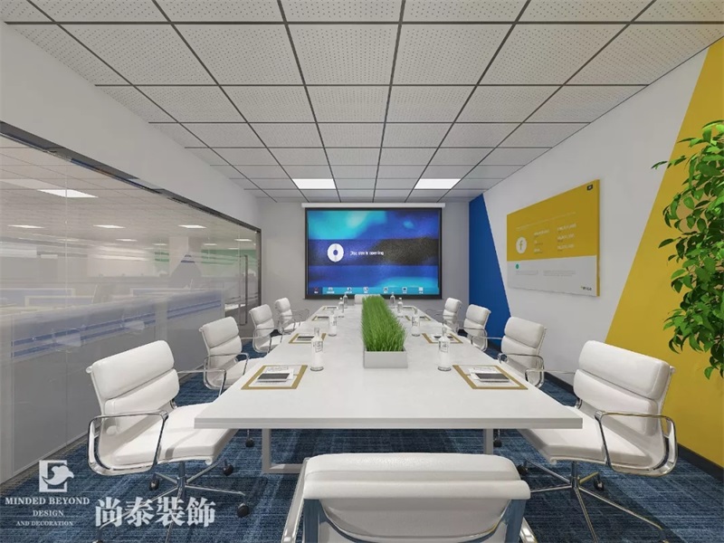 會(huì)議室作為一個(gè)集中和接待的區(qū)域,主色帶采用了白色,另外通過(guò)藍(lán)色和黃色作為點(diǎn)綴,在布置方面顯得更加大氣,同時(shí)強(qiáng)調(diào)了對(duì)空間的儀式感。