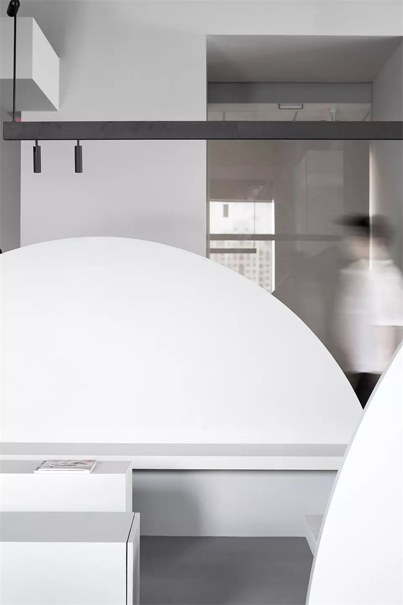 空間以方盒子作為主要框架,交談區(qū)的半圓與單一體塊共存,開放的形態(tài)空間延伸到頂上的圓球,