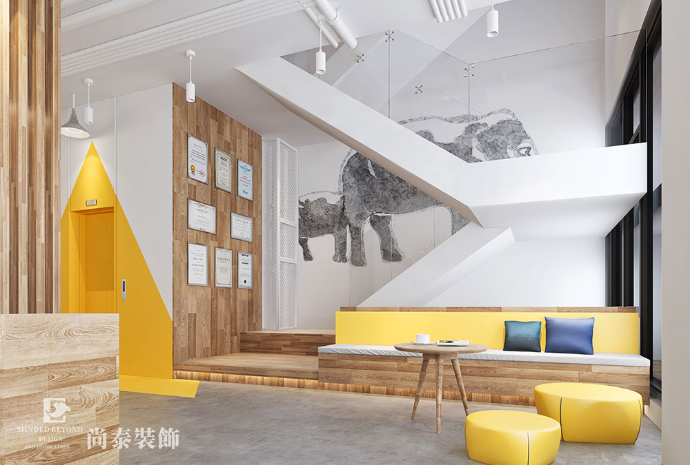 該項目位于天河區(qū)智匯創(chuàng)意園,園區(qū)的辦公室全部采用了聯(lián)排別墅的形式,共有三層,并附帶前后花園,擁有非常舒適愜意的環(huán)境優(yōu)勢。本案設(shè)計由深圳裝修公司尚泰裝飾設(shè)計團(tuán)隊執(zhí)行,整個設(shè)計采用工業(yè)風(fēng),以白色為基調(diào),間或融入自然原木色,營造出細(xì)膩細(xì)微的的情緒氛圍。白色與木色的劃分豐富了空間的層次感,小面積跳躍黃色的點綴則增加了空間的生機(jī)和活力。