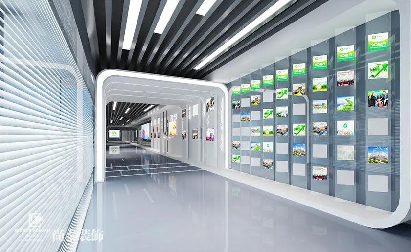 過道以無(wú)色系黑白灰做出空間的高級(jí)感和科技感。此處還設(shè)計(jì)了一個(gè)通往未來(lái)的“時(shí)光門”,獨(dú)特的天花線條和燈帶向前延伸,吸引著訪客的腳步。右側(cè)的企宣柜做成“格子”狀,吸引著訪客的目光,為訪客講述著企業(yè)故事與過往功勛。