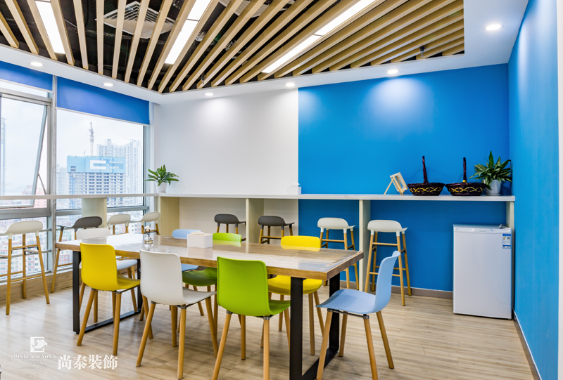 水吧,作為員工經常出入的一個地方,讓辦公累了的時候,進來接一下水,整個感覺都不一樣了,疲勞也消失了。作為水吧,除了飲水機,應該還有冰箱、微波爐、冰箱等,真正的做到了物盡其用,五顏六色的椅子,藍白相接的粉刷,如大海一般。