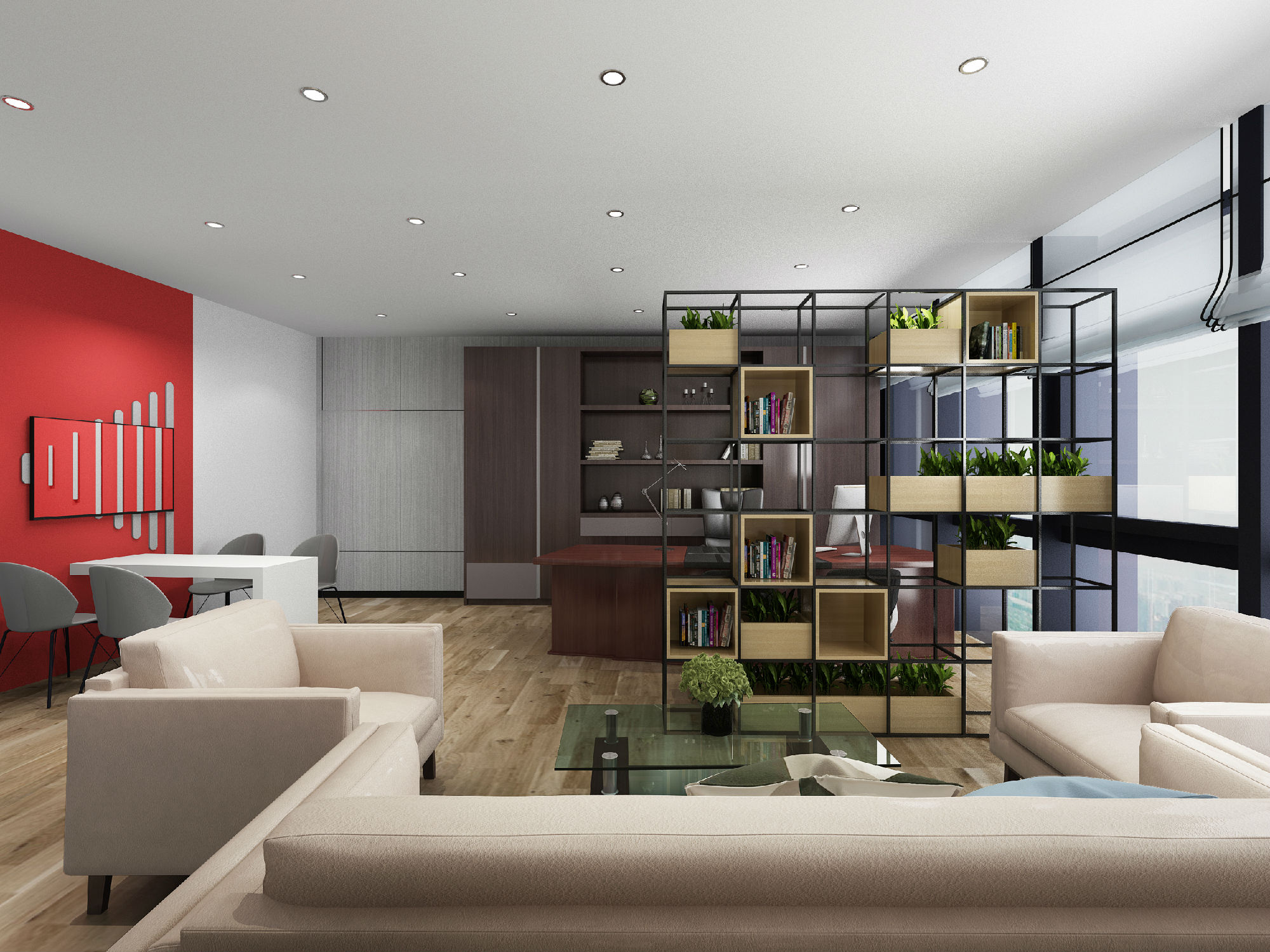 前廳區(qū)域主要以科技現(xiàn)代為主,在擴(kuò)大了前廳空間的同時,又給人一種賓至如歸的感覺;整體主色調(diào)為白色為主,局部點(diǎn)綴紅色,主要強(qiáng)調(diào)視覺感官的沖擊感,突出科技公司的企業(yè)形象,讓客戶對公司有深刻的印象。局部大理石、木紋鋁格柵的運(yùn)用,既提升了檔次,又增添少許休閑感。洽談區(qū)以玻璃隔墻為主,提升空間的通透性,地面采用木紋地膠材質(zhì),提升空間舒適感。