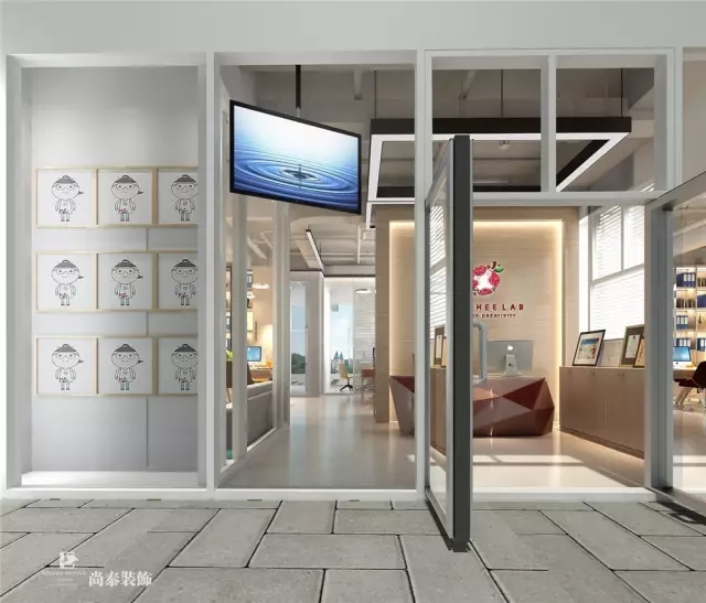步入前廳接待區(qū),簡潔清晰的前臺造型和右側(cè)的展示柜一下子吸引了人們的眼球,伴著天花板上面燈具照明的效果,該區(qū)域增加了一種開放的氛圍和現(xiàn)代的感覺,使人達(dá)成對于創(chuàng)客品牌有效的視覺溝通和傳播。