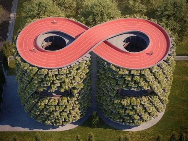 建筑的體量設計為兩個“綠色”圓柱體,它們由屋頂“無限”自行車道連接,每個圓柱體都代表著計劃項目的一個建設階段。彎曲的立面布滿了一系列均勻的突出物和茂盛的植被。項目的目的是形成一個“充滿活力的表皮”,以改善空氣質量和學生的整體健康。