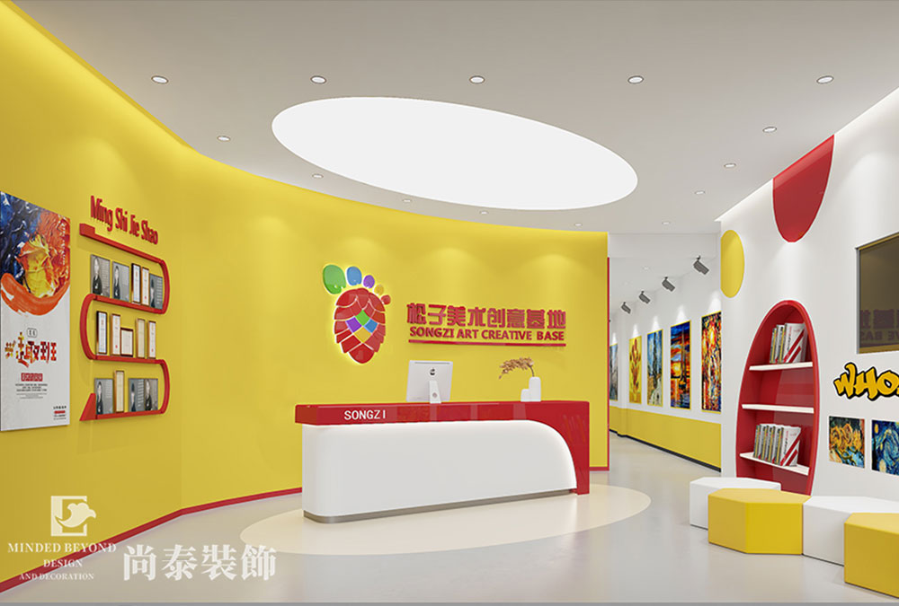松子美術(shù)創(chuàng)意基地為小區(qū)街店,類型屬于兒童繪畫藝術(shù)培訓(xùn)類商鋪,主要經(jīng)營(yíng)兒童繪畫培訓(xùn),消費(fèi)人群主要是3-12歲小孩。本項(xiàng)目為繪畫藝術(shù)類空間,也是連鎖品牌店,在原有風(fēng)格上做品牌升級(jí),所以空間中也摒棄原校區(qū)大紅大黃的空間色塊,創(chuàng)立一個(gè)以白色為主色調(diào),以黃色紅色為點(diǎn)綴色的空間色調(diào)搭配,呼應(yīng)品牌主題色的同時(shí)也營(yíng)造一個(gè)使體驗(yàn)者更為舒適的空間氛圍,弧形的空間造型打造出對(duì)孩子們成長(zhǎng)呵護(hù)的安全區(qū),也呼應(yīng)了松子的logo造型在整個(gè)空間更讓家長(zhǎng)們體驗(yàn)到松子濃郁的藝術(shù)氛圍。