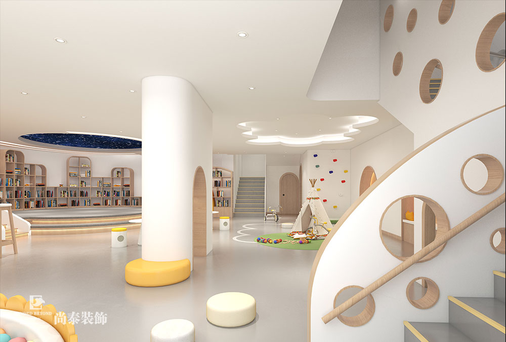 早教中心不是游樂園,而是一個自然、真實、樸素、舒適的學習場所,讓孩子們感受、學習、成長、這正是一座優(yōu)秀早教機構真正的意義。本案主要運用了最淳樸的原木色,體現(xiàn)出大自然的柔和感,并給人以安心舒適的視覺感,又巧妙的運用了品牌的暖黃色和橙色調,給整體視覺感上又帶來了活潑生機的氣息?;《仁窃缃虣C構中的元素,是為了幼兒的安全性考慮,同時也增加了整體空間感,在視覺上也給人耳目一新的感覺。從二維的線條到三維的體塊,潛移默化中引導著孩子的想象力、創(chuàng)造力、記憶力、專注力、思維力木質園門、蔥郁的樹脂玻璃鋼假樹······如同置身童話世界,整體氛圍亦如明快的黃色,輕松愉快;簡單的木紋展柜等設置又恰如其分的提升了品牌得魅力。